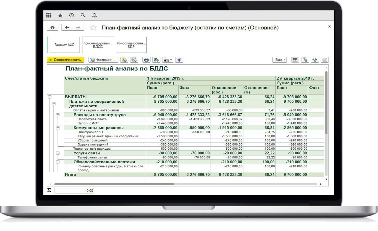 Покажем план-фактный анализ по доходам и расходам в разрезе статей оборотов, проектов, ЦФО. Мы создадим отчет, позволяющий анализировать данные как в разрезе отдельных юридических лиц, так и консолидированно по всем организациям группы.