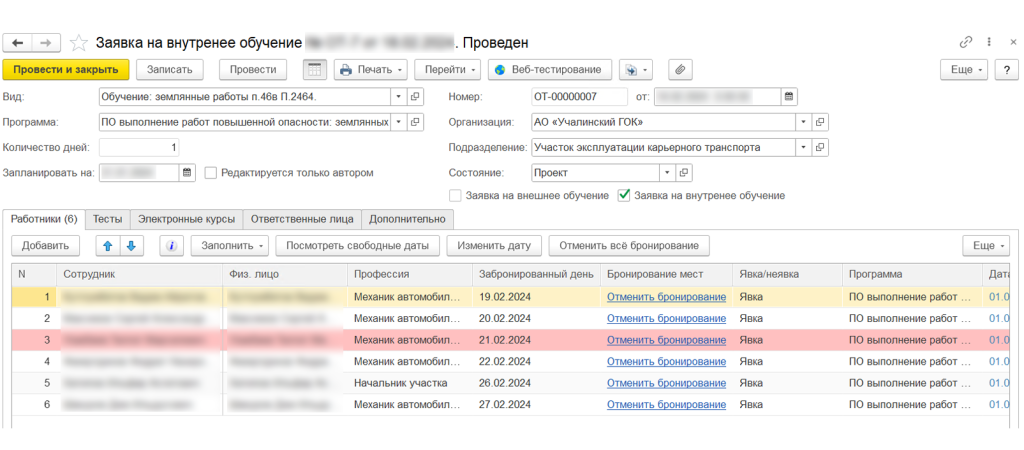 В ходе автоматизации на предприятии сформировали собственный справочник видов обучения и программ в области ОТ и ПБ. Обучения проводятся в оборудованном учебном классе. Руководители подразделений получили возможность планировать обучения и бронировать места в классе для отдельных сотрудников.