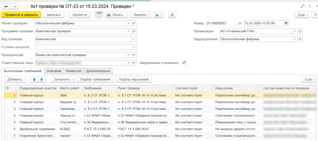 • проведение проверок с фиксацией выявленных нарушений, при котором есть возможность оценить и классифицировать типы риска нарушений, а также назначить ответственного за устранение нарушения сотрудника.