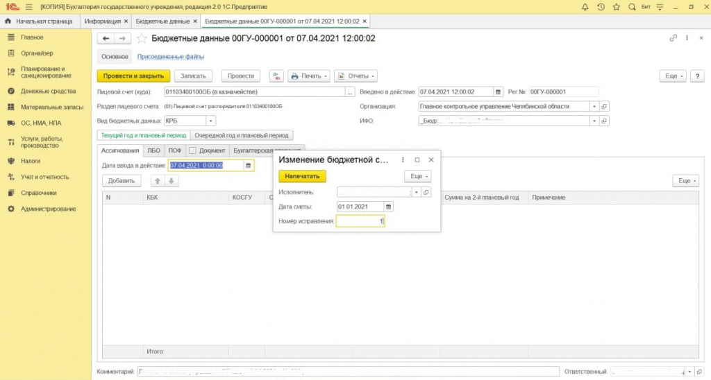 Теперь у ГКУ Челябинской области Смета и Изменения бюджетной сметы формируются автоматически на основании данных документа «Бюджетные данные», учитывая все изменения с начала года.