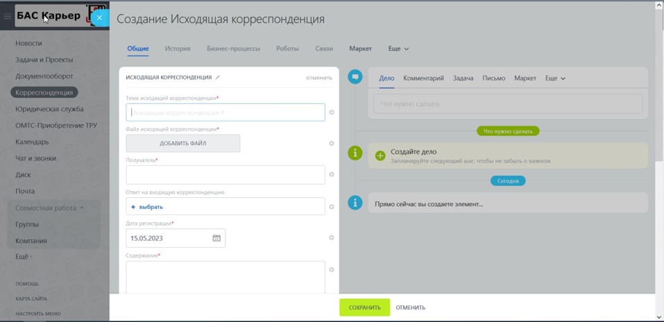 Формирование исходящей корреспонденции