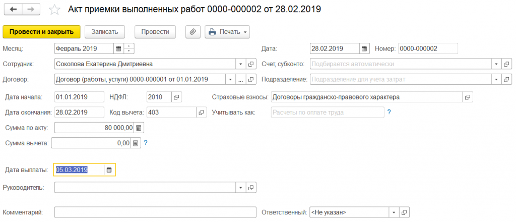 В конце месяца отразим акт выполненных работ на оставшуюся сумму вознаграждения. Месяц начисления февраль 2019, дата акта 28.02.2019, начисление рассчитаем при окончательном расчете заработной платы.