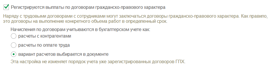 Если вы уже давно работаете в программе и не сможете зайти в помощник начальной настройки, не расстраивайтесь, можно открыть меню «Настройка», перейти в «Расчет зарплаты» и поставить галку «Регистрируются выплаты по договорам ГПХ».