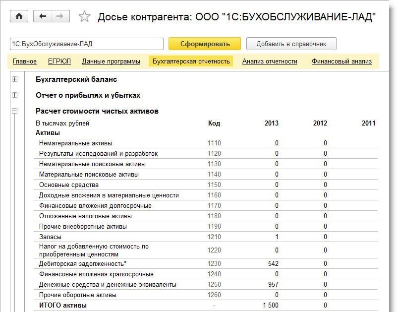 • Отчет «Досье контрагента» покажет по любой фирме: все сведения из ЕГРЮЛ, бухгалтерскую отчетность, информацию о проверках госорганами и финансовый анализ деятельности. Можно быстро оценить надёжность контрагента.