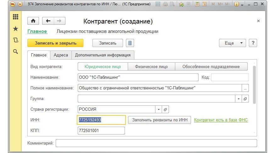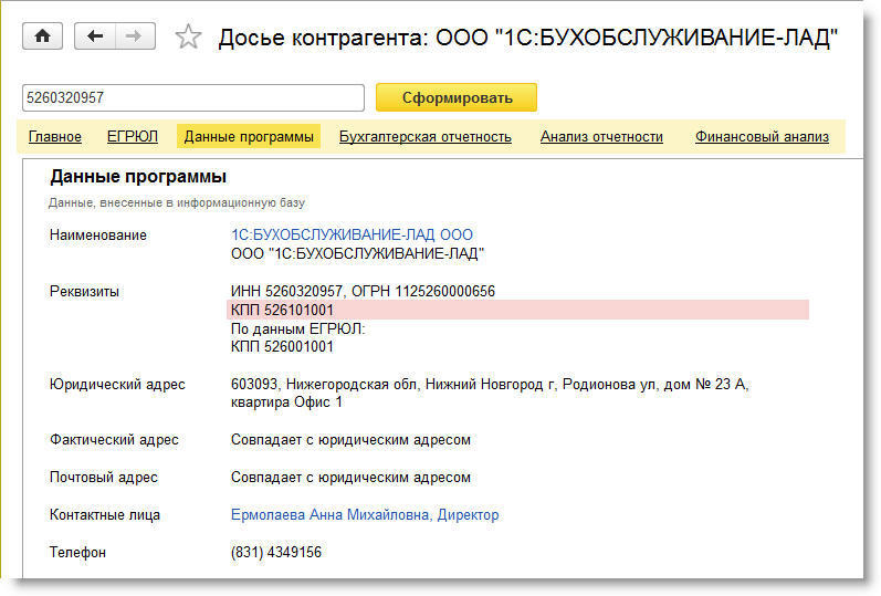 По ИНН данные из реестра заполняются автоматически КПП, краткое и полное наименование, юридический адрес, руководитель компании контрагента.