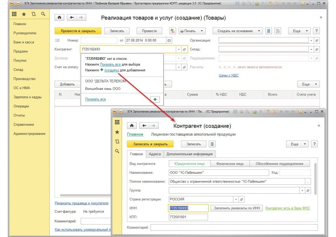 • Введите ИНН любой фирмы или ИП, и карточка контрагента заполнится моментально и без ошибок.